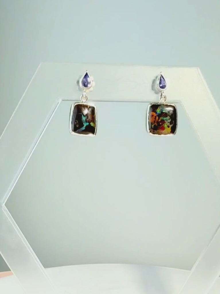 Boulder Opal and Pear-cut Tanzanite Silver Drop Earrings