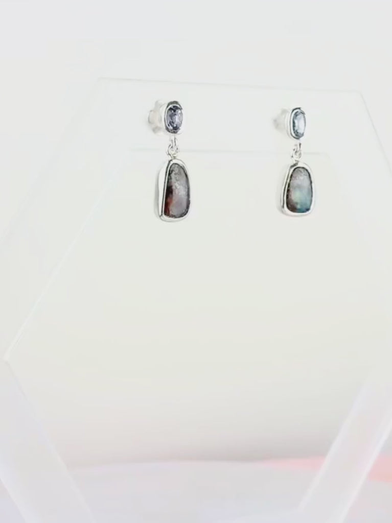 Boulder Opal and Silver Blue Sapphires Silver Drop Earrings
