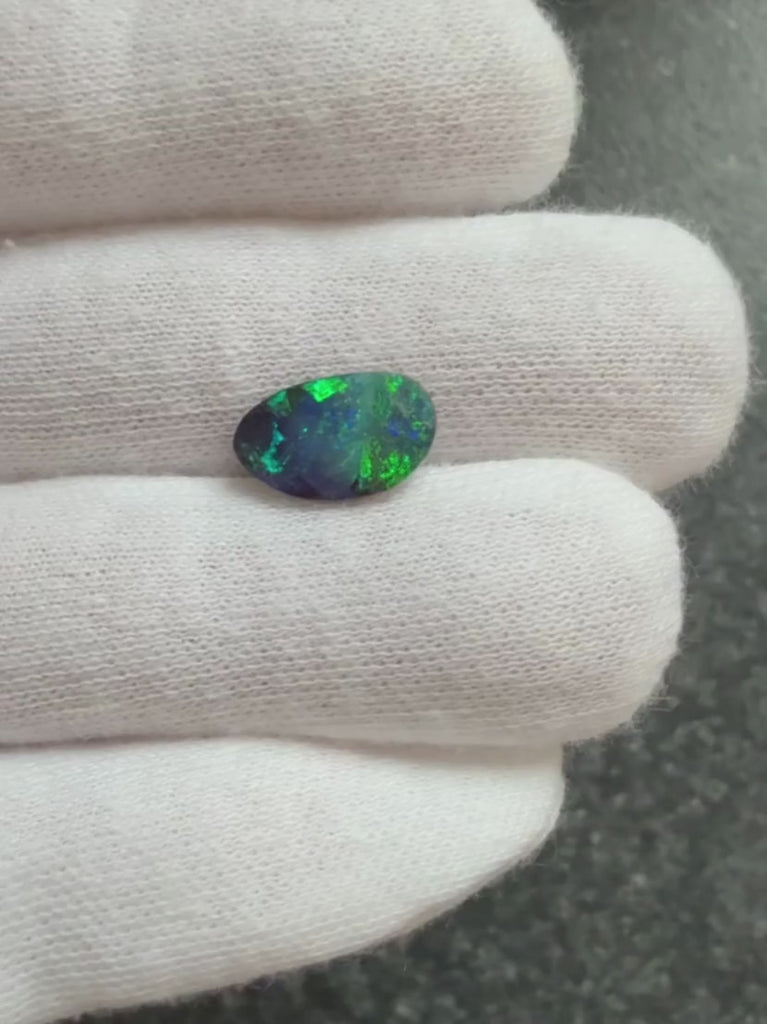 Striking Australian Boulder Opal with deep ocean hues of electric blue and emerald green star patterns hence the name, Green Star. This natural solid oval-shaped opal, sourced from our family’s Big Red Mine in Western Queensland, shows intense colour play and depth in a dark background, making it a standout stone for a custom pendant or statement ring.
